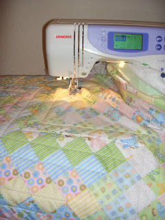 Edit: I decided the pictures above don't really give any impression of the size of the quilt so, lacking a convenient small child to photograph, I have enlisted the help of Tiger (who is pretty much baby-sized) to bring you the following quilt-simulation... basically it will be plenty big enough for baby and should carry over quite nicely from cot to cot-bed as s/he grows up. Thanks to some artful corner turning you can also see the backing which quilted delightfully (not a tuck in sight!) and, according to Rob, will give them the alternative of using the quilt upside down as well... not sure what I think to the idea of hiding all my lovely patchwork in favour of an Ikea bedspread but I'm sure he meant well!