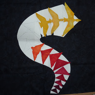 I started designing this quilt just before we moved house (June 09!) and it got shelved because, whilst it was easy enough to draw the quilt, I realised I had no idea how to actually make it. Fortunately that all changed when I went on a Machine Applique course for my birthday (March 10) and finally understood how to prepare fabric shapes for appliqueing. Last week I had a bit of spare time and it all came together suprisingly fast - I need to redraft the middle few geese as the shapes I was originally planning had teeny little insets which are too narrow to give me enough seam allowance to actually make them but other than that I'm pretty pleased with the results.