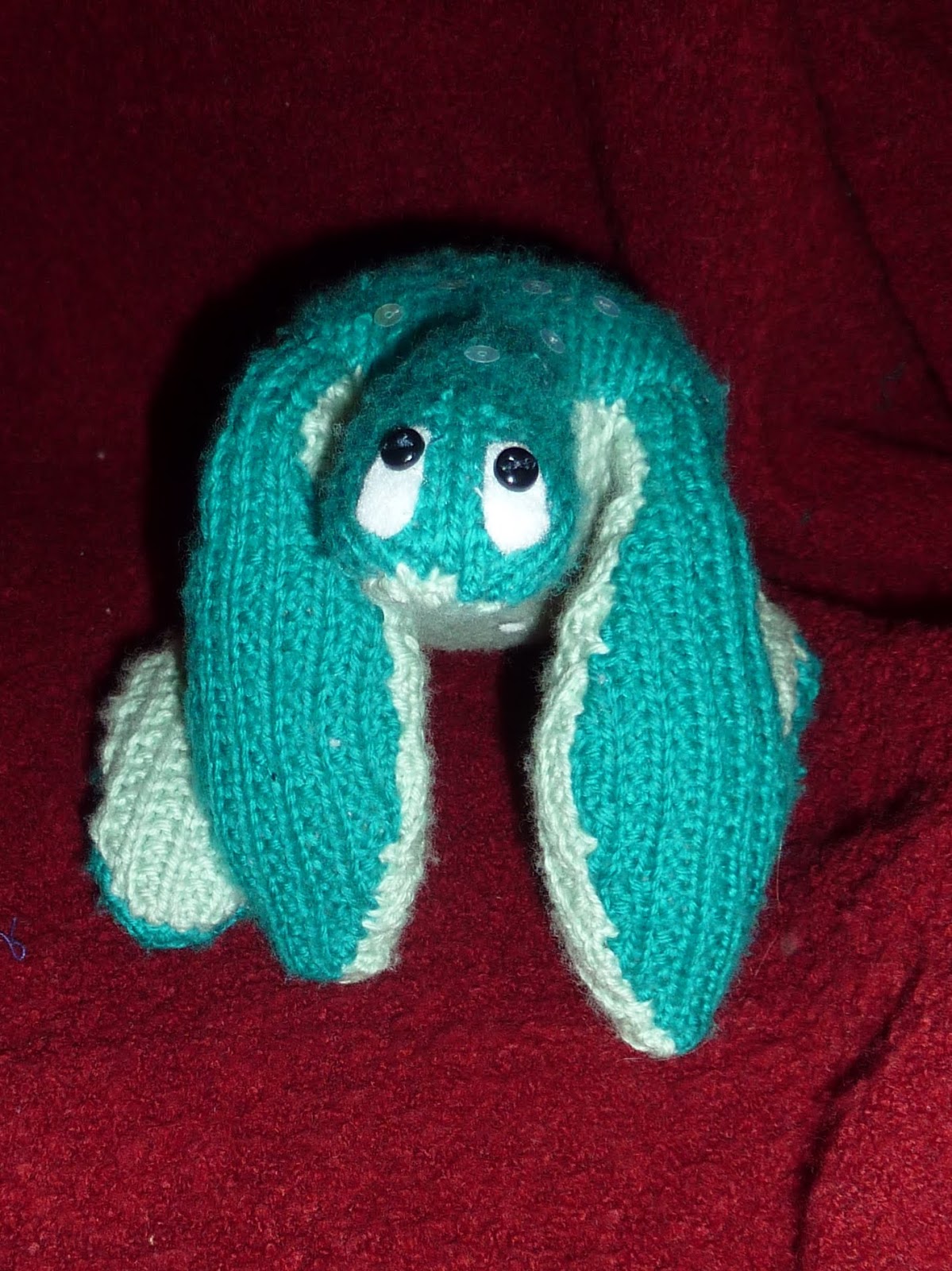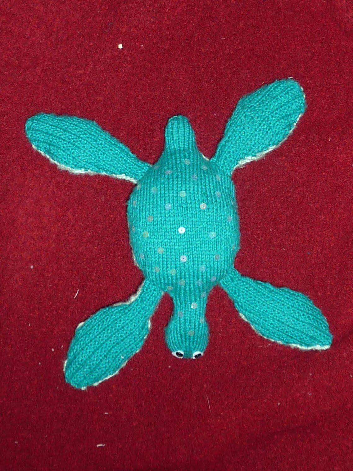 He is knitted with Merino wool and is wonderfully soft to the touch, his back is decorated with semi-transparent sequins and his eyes are made from tiny little buttons and a bit of white felt.